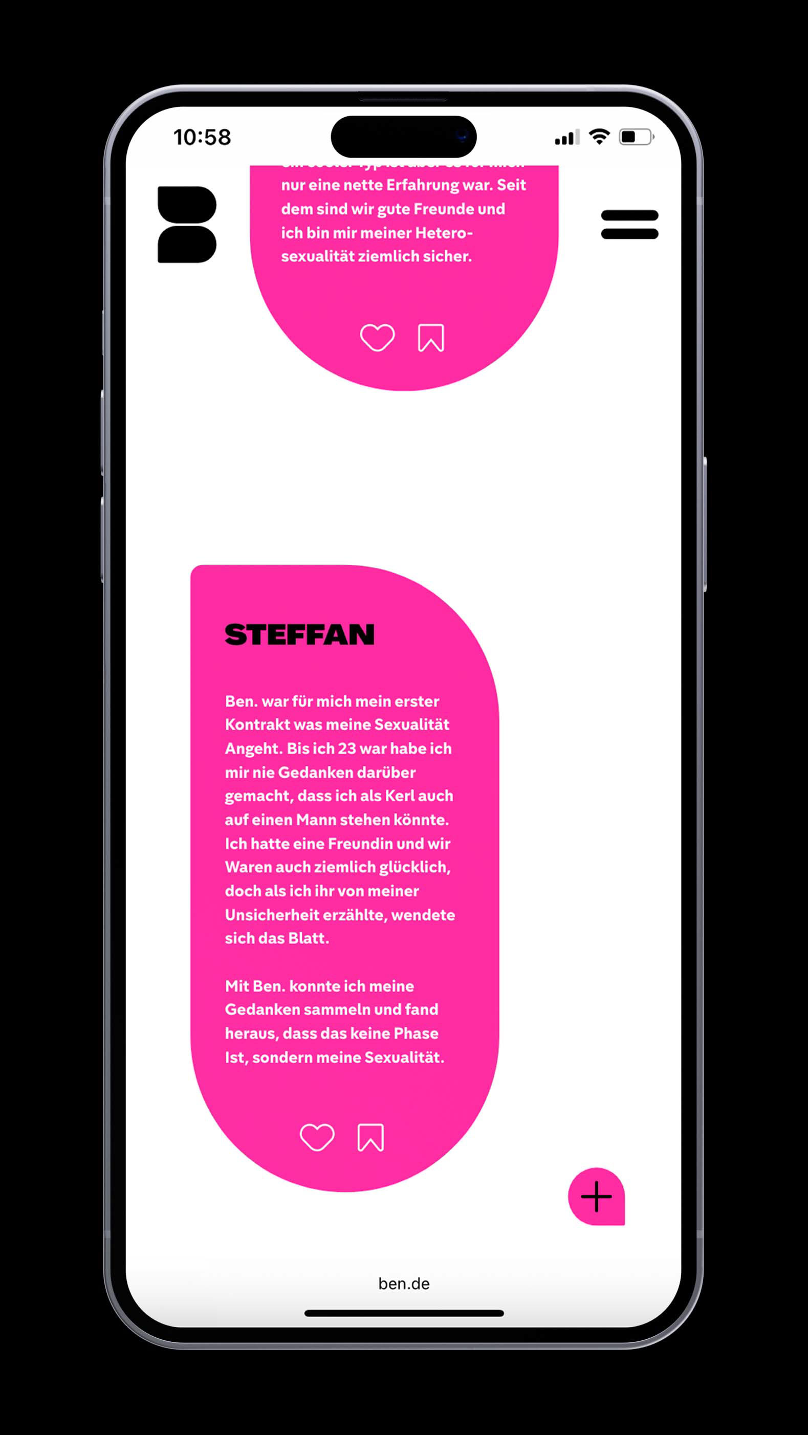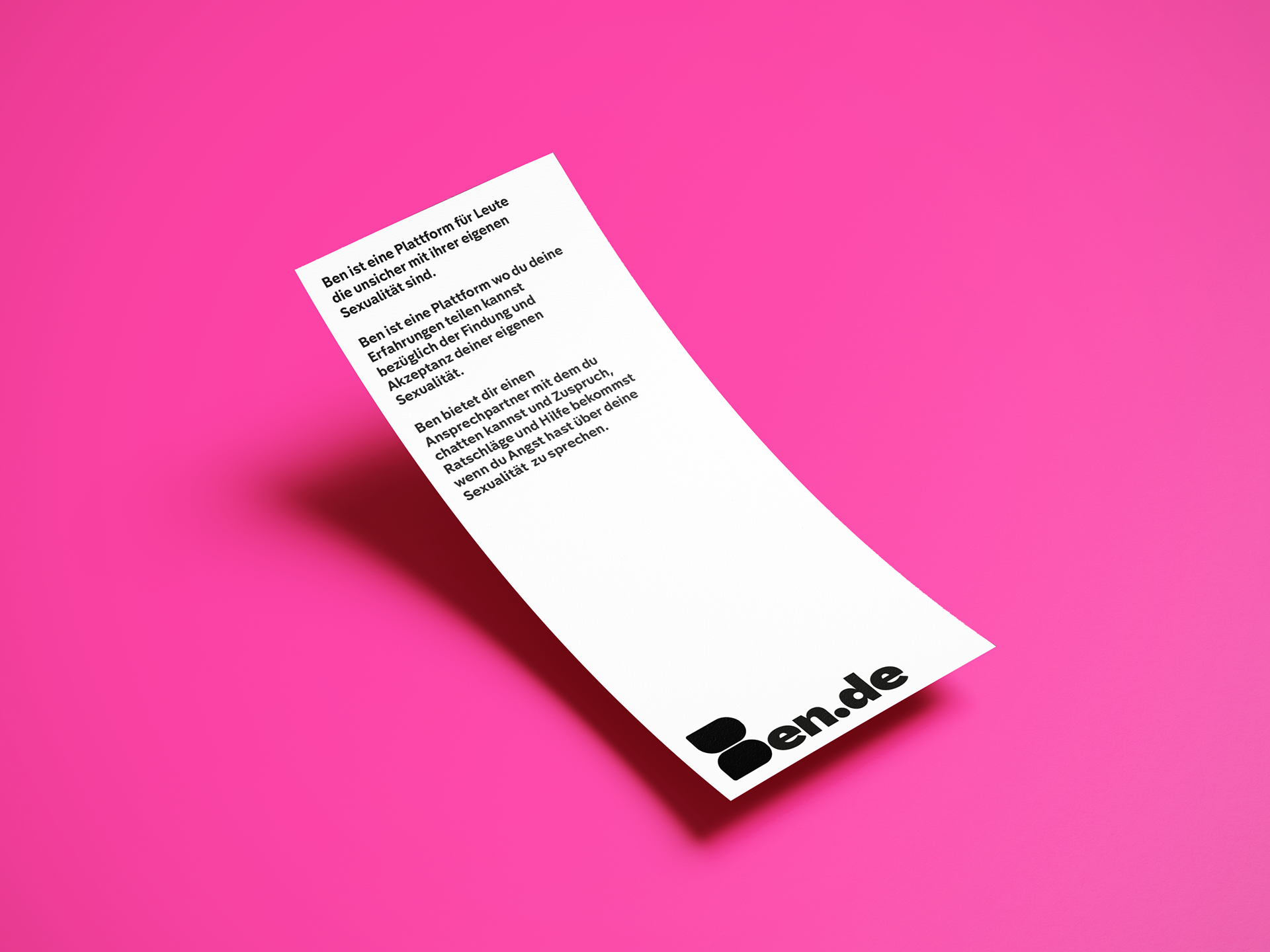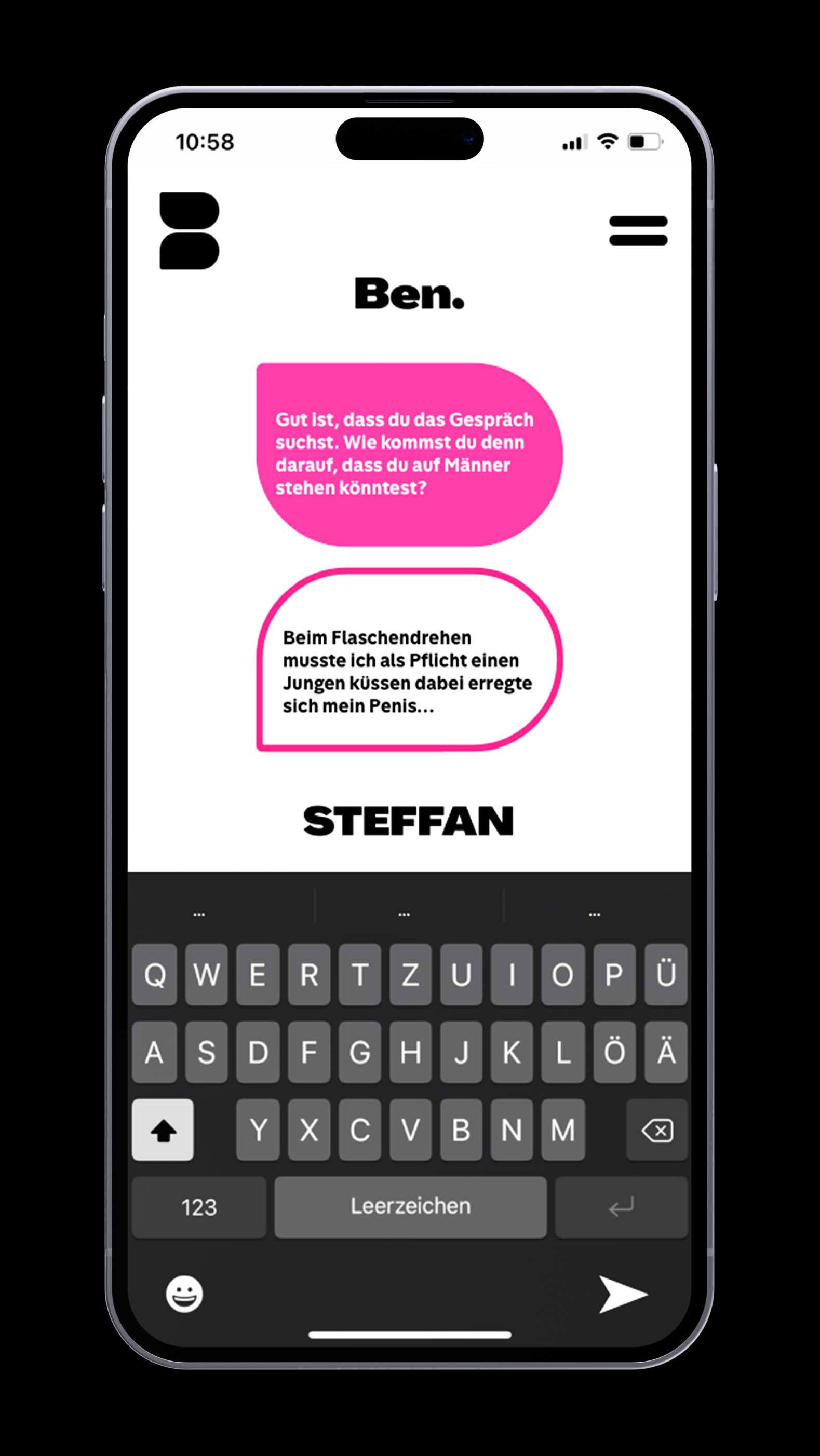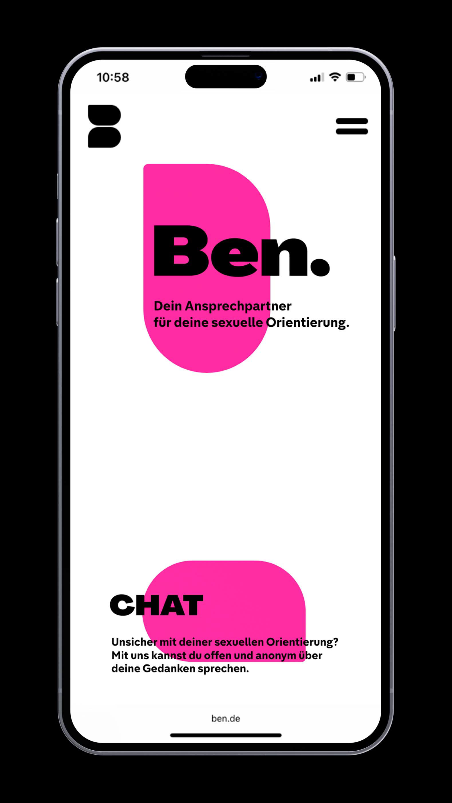 Ben bietet einen sicheren, anonymen Raum, in dem man vertrauliche Ansprechpartner:innen finden kann für alle, die sich noch nicht trauen, offen über ihre Sexualität zu sprechen. Darüber hinaus ist Ben eine Plattform, die den Austausch von Erfahrungen ermöglicht für alle, die sich in ähnlichen Situationen befinden und gegenseitig Halt suchen.