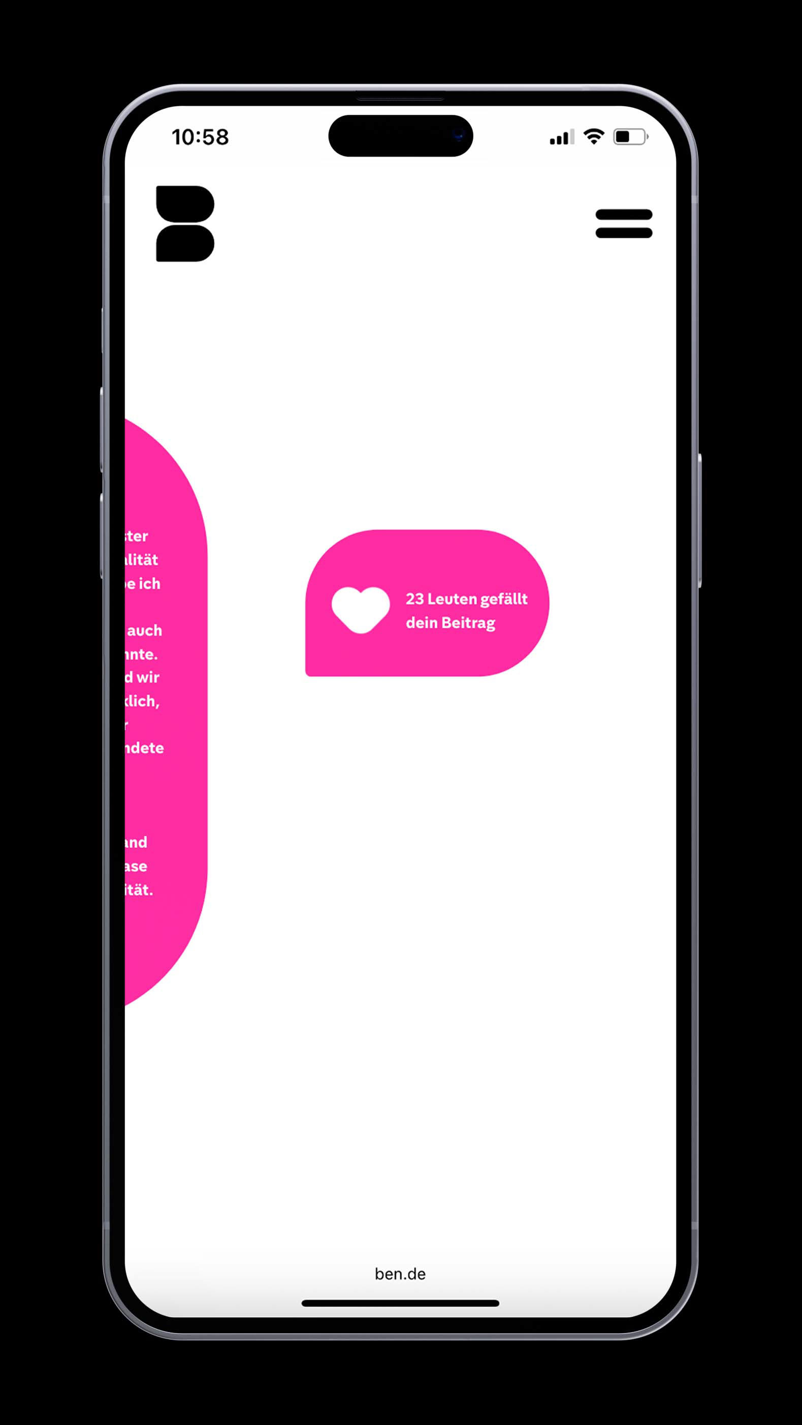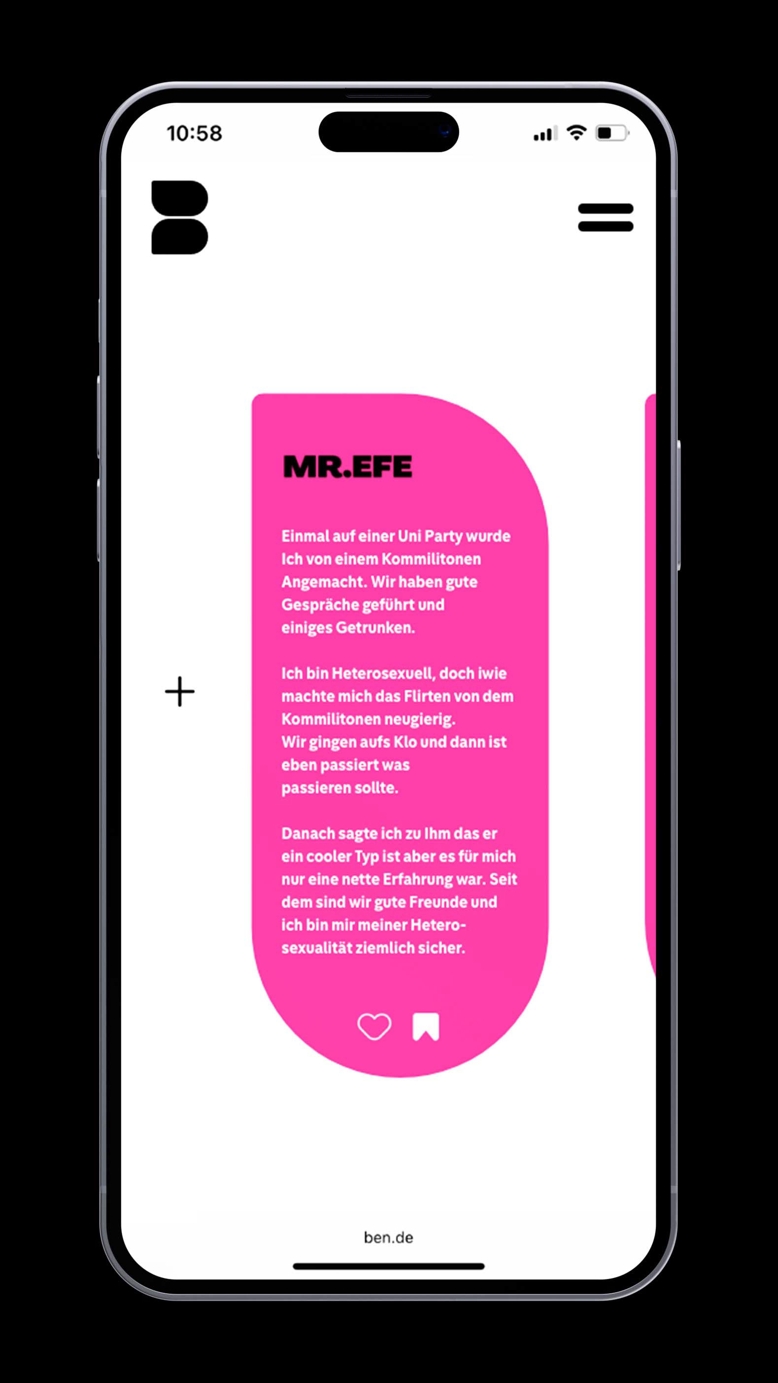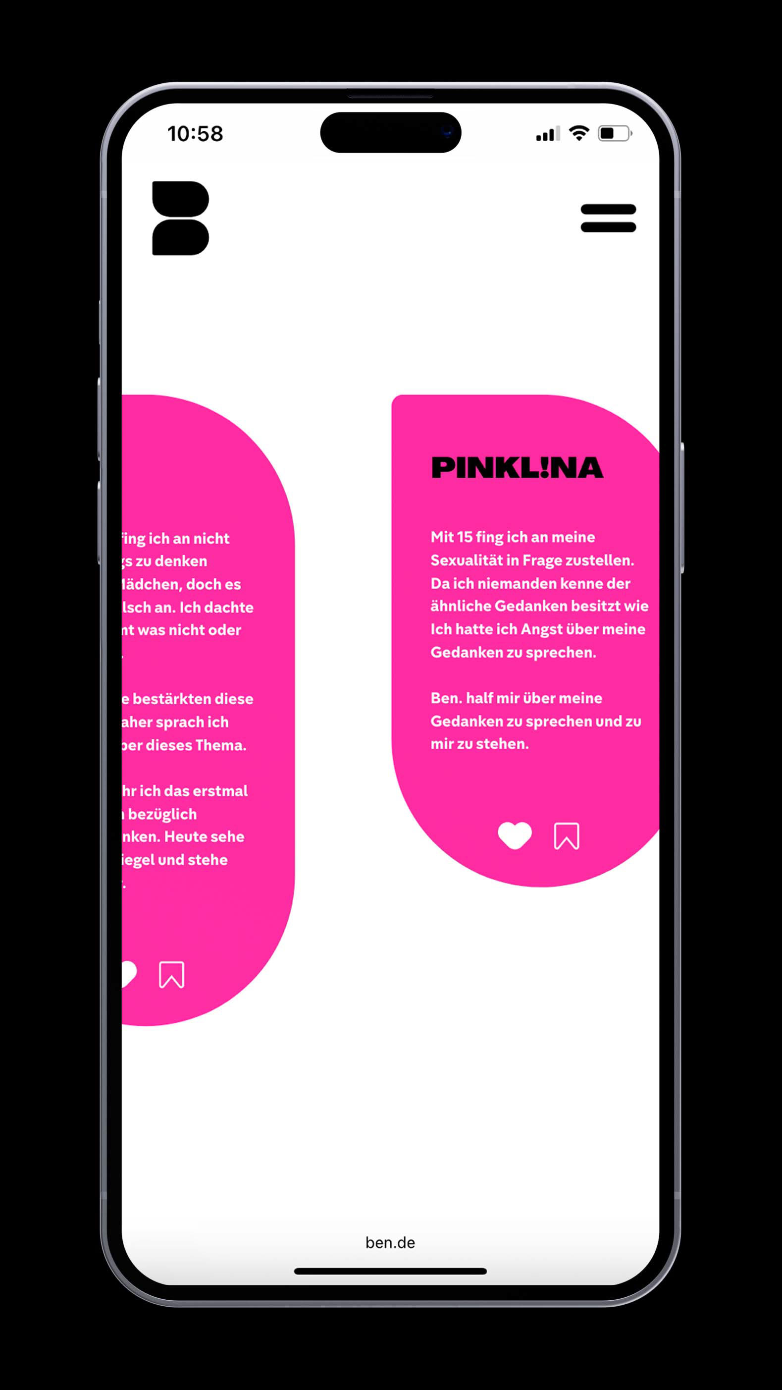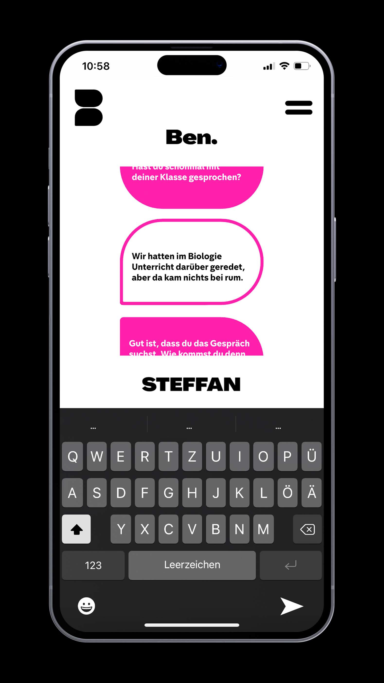 Ben bietet einen sicheren, anonymen Raum, in dem man vertrauliche Ansprechpartner:innen finden kann für alle, die sich noch nicht trauen, offen über ihre Sexualität zu sprechen. Darüber hinaus ist Ben eine Plattform, die den Austausch von Erfahrungen ermöglicht für alle, die sich in ähnlichen Situationen befinden und gegenseitig Halt suchen.