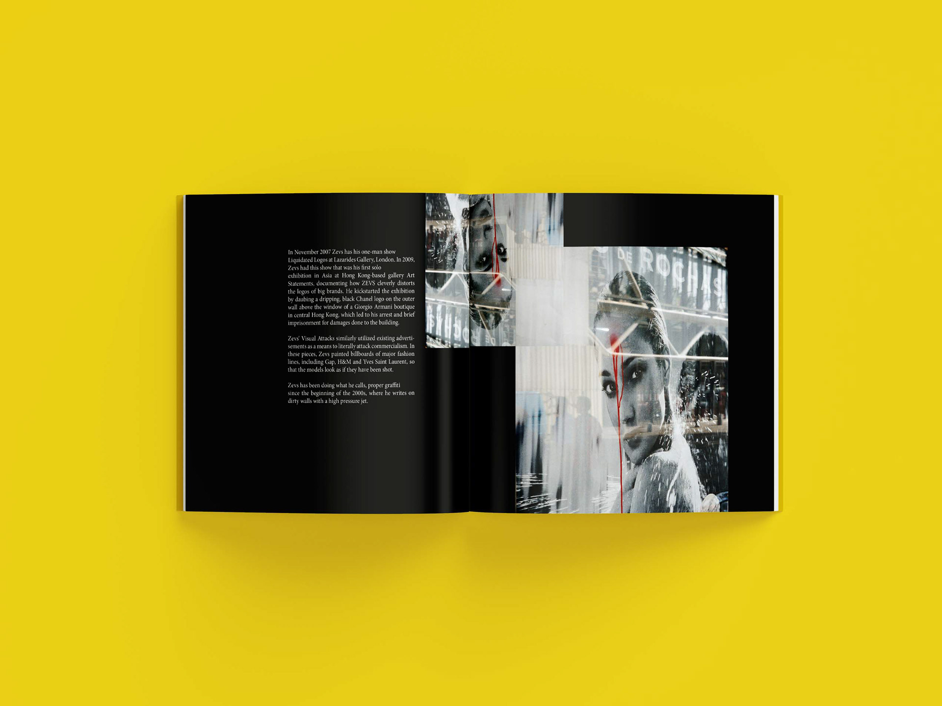 Mit seiner innovativen „Liquidation“-Technik schafft Zevs neue Ausdrucksformen in der Graffitikunst. Um seine Botschaft noch schärfer und prägnanter zu transportieren, habe ich eine Graffiti-Font entwickelt, die auf dieser Technik basiert. Zusammen mit weiteren Gestaltungselementen bringt die Schrift seine Kunst nicht nur inhaltlich, sondern auch visuell kraftvoller zur Geltung.